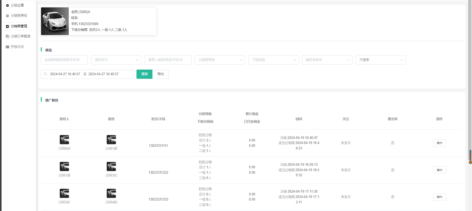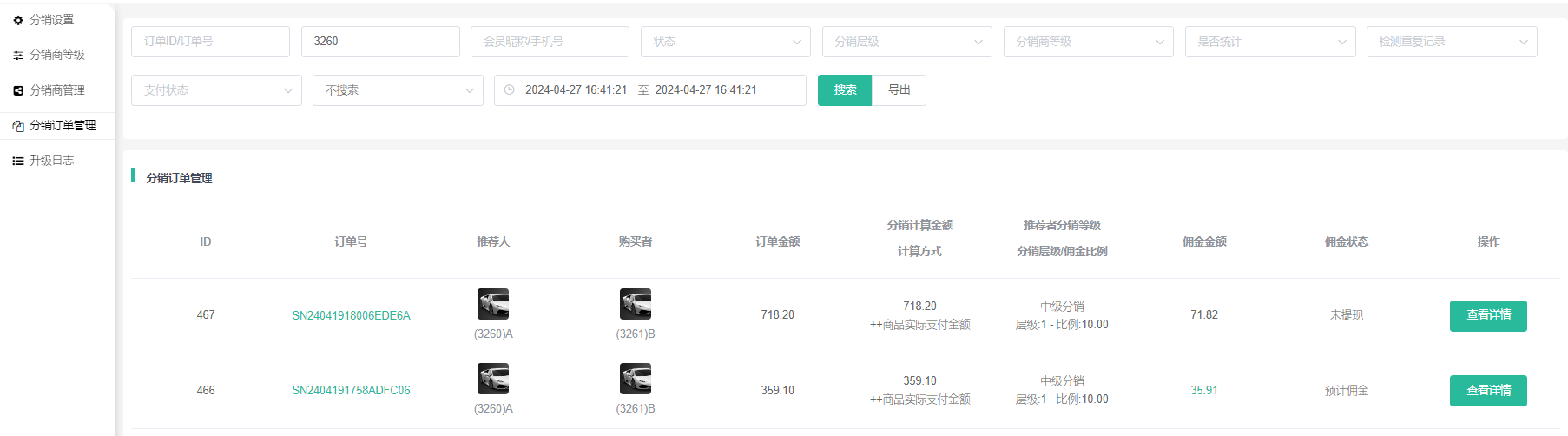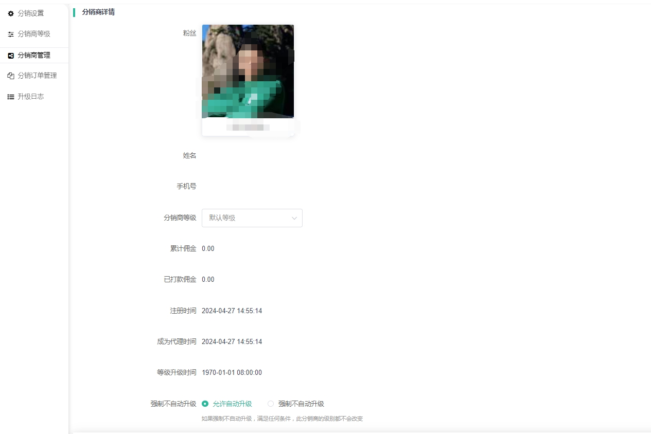 详细信息:是查看该会员分销商的详细信息,可查看分销商等级(可手动修改分销商等级),累计佣金,已打款佣金,注册时间,成为代理的时间,等级升级时间等