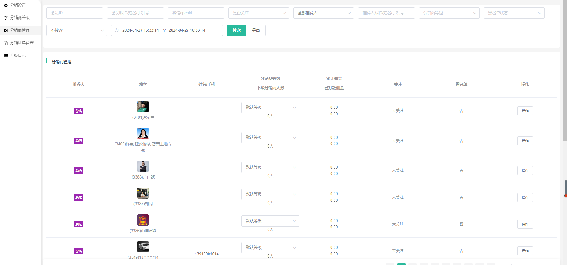搜索可按照成为分销商时间/会员信息/是否关注/推荐人/分销商等级/状态,搜索导出列表记录信息