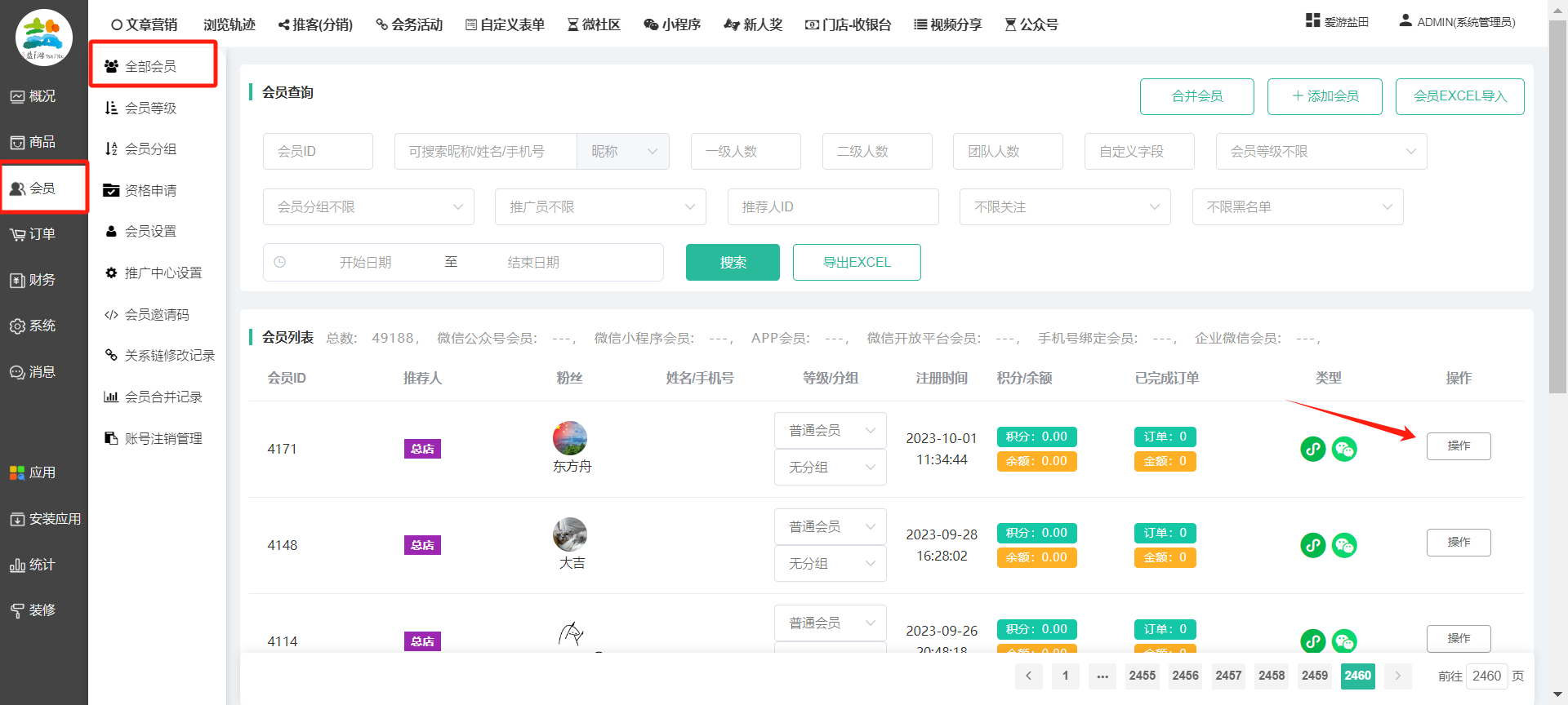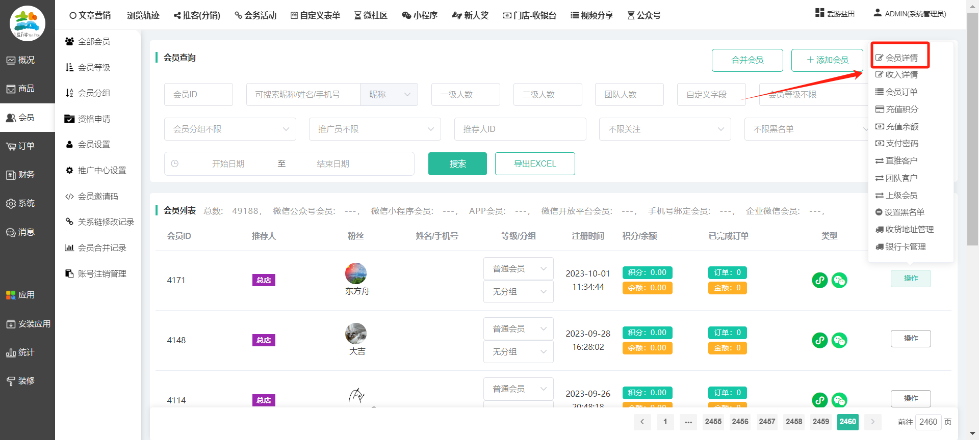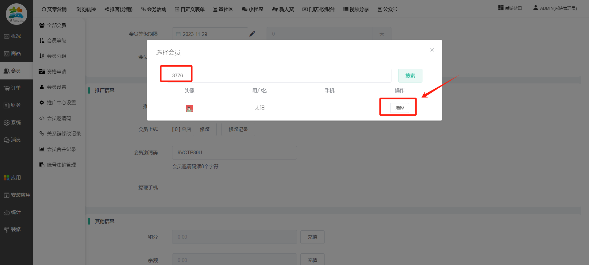 目录 搜索 展开 一、前期准备资料二、数字乡村码-上线操作指南1、服务号的申请流程及认证2、申请小程序流程3、开放平台绑定小程序和公众号三、数字乡村码-系统操作数字乡村码系统管理-概况数字乡村码-商品管理1、发布商品2、商品列表3、商品表单4、商品分类5、品牌管理6、配送模板7、评论管理8、优惠券管理9、商品标签10、退货地址设置11、满额优惠12、批量操作13、配送方式14、基础设置15、商品隐藏四、数字乡村码-会员管理1、全部会员2、会员等级3、会员分组4、资格申请5、会员设置6、推广中心设置7、会员邀请码8、会员关系链修改关系链修改记录9、会员合并记录10、账号注销管理11、会员设置中心五、数字乡村码-订单管理1、订单管理列表2、订单处理流程3、订单状态4、订单修改价格5、订单退款退货6、多包裹发货7、批量发货订单操作步骤8、催发货订单9、物流查询六、数字乡村码-财务管理1、余额设置2、会员余额3、充值记录4、转让记录5、余额明细6、收入明细7、提现设置8、提现统计9、积分管理10、转账审核11、收益广告12、批量充值七、数字乡村码-系统管理1、商城入口2、商城设置①、商城设置②、订单设置③、物流查询④、短信⑤、联系方式⑥、分类⑦、优惠券⑧、分享⑨、幻灯片⑩、广告位⑫、地图设置3、交易设置4、微信模板消息自定义消息模板(新版)自定义消息模板(旧版)小程序消息模板公众号模板消息变更公告5、语言设置6、权限管理7、多媒体管理八、数字乡村码-消息管理九、数字乡村码-应用管理十、数字乡村码系统-数据统计十一、数字乡村码-页面装修DIY1、模板管理2、店铺页面3、顶部导航4、底部导航5、DIY模板市场6、首屏广告7、基础设置8、装修DIY尺寸建议十二、供应商功能插件操作指南1、供应商2、门店-收银台门店申请和使用步骤门店管理①、门店-收银台 营销设置②、门店-收银台 分润设置门店分类门店申请门店审核门店商品门店商品订单收银台订单数据统计核销员基础设置默认设置门店装修3、微社区4、会务活动十三、营销插件操作指南活动报名提货卡新人奖微店问卷调查积分视频分享1、视频分享基础设置2、视频分享发现管理3、视频分享分类管理4、视频分享评论管理5、视频分享分红记录6、视频分享短视频中心每日红包幸运大抽奖签到优惠券二维码任务奖励优惠劵文章音频文章付费文章限时购新海报拓客卡操作流程积分活动素材中心视频红包十四、入驻门店应用类1、门店预约2、附近商品3、门店定位设置4、门店控制5、门店满额包邮6、门店满额减7、导入商品8、门店搜索9、门店股东10、核销券11、多门店核销1、商城后台设置2、前端功能演示十五、常见问题1、后台登录密码修改流程2、会员-余额,积分,后台如何进行充值与扣除3、如何修改上下级关系4、一种万能的获取商城小程序路径的方法 暂无相关搜索结果! 阅读次数:1557 本文档使用 模王系统 发布 8、会员关系链修改 8、会员关系链修改一.如何修改上下级关系?1.会员-全部会员-可以通过搜索用户的独立ID,或者用户微信昵称,找到此会员,然后点击右边的(操作)2.再点击会员详情。3.滑到下面,有个推广信息-会员上线,点击修改4.输入上级的ID号,点击搜索,出来此上级会员后点击选择。5.滑到最下面,一定要点击提交按钮。文档更新时间: 2023-11-30 14:56 作者:链上旅行