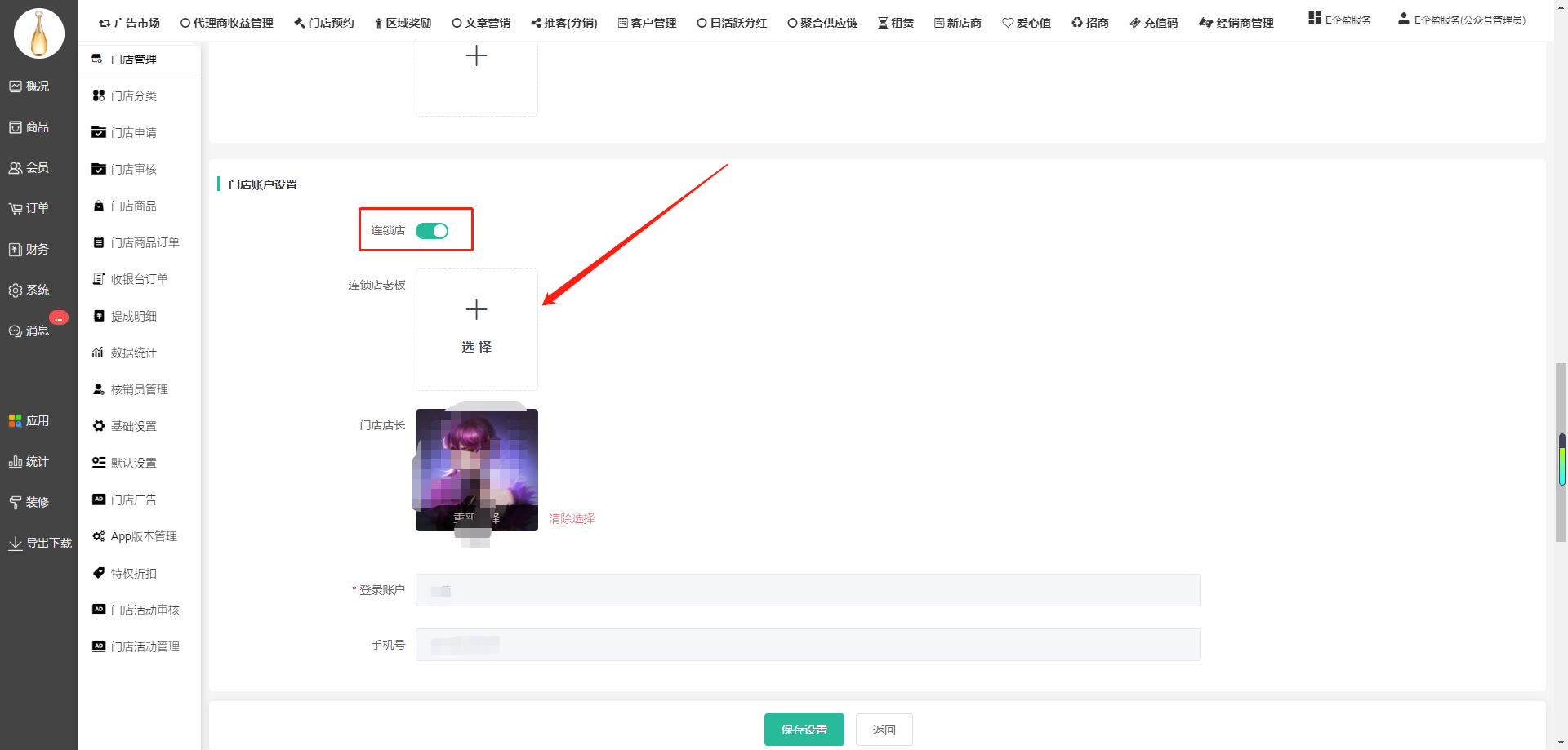 门店管理--操作--门店信息--门店账号设置--连锁店开启--进行选择